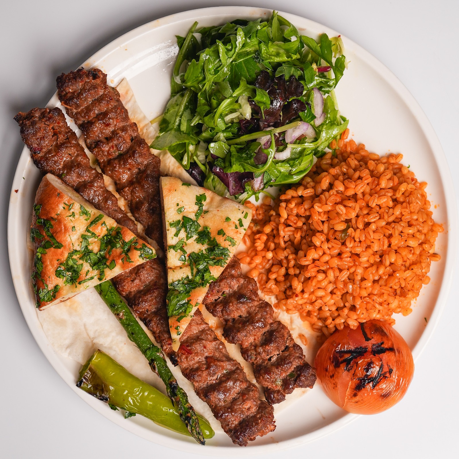 A mix of beef and chicken shawarma, adana kebab, lahmacun, chicken shish, comes with a side of rice, salad, in-house bread and traditional sauces.