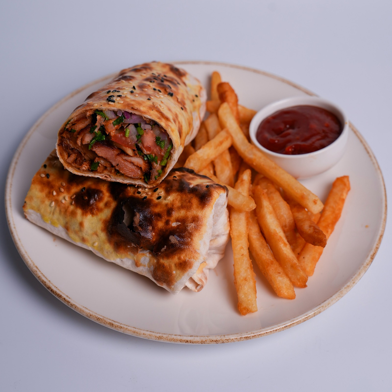 Thinly sliced, marinated meat slowly roasted on a vertical rotisserie, served fresh off the spit. Enjoy the authentic flavors of the Middle East with every bite, accompanied by rice, salad, and traditional sauces.
