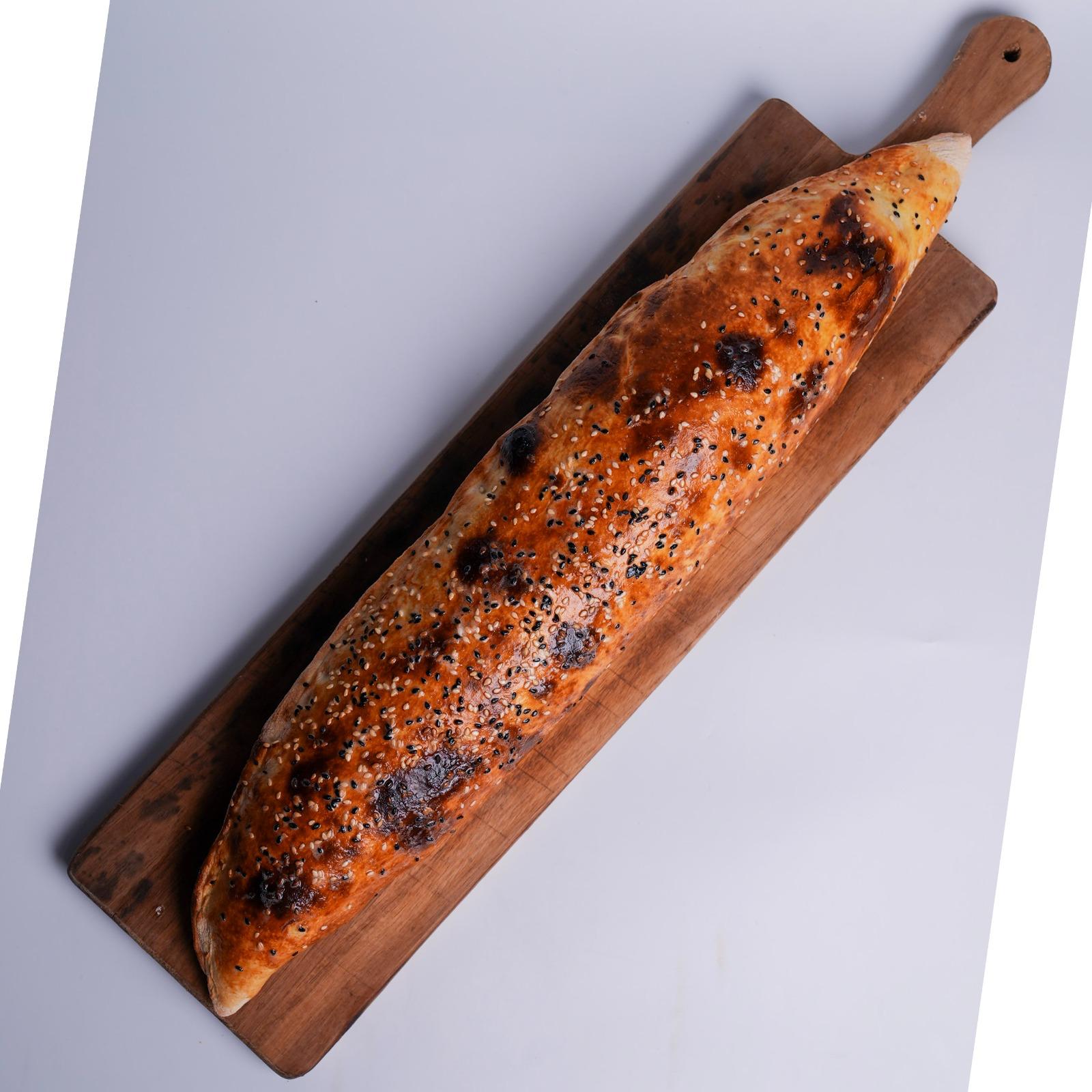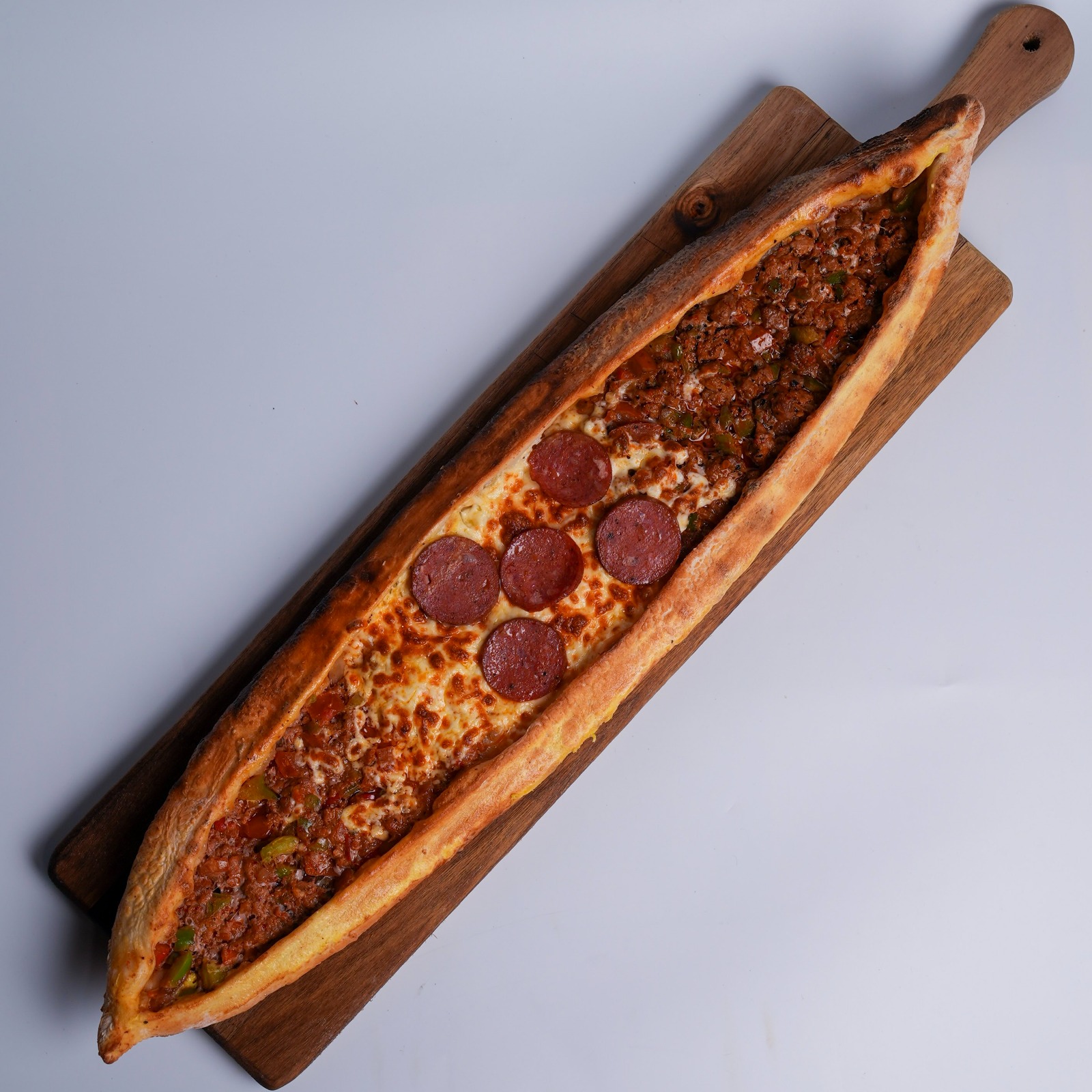 Turkish-style flatbread topped with melted cheese and spicy peperoni, baked to perfection.